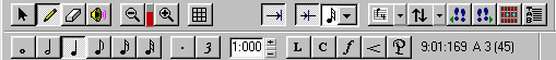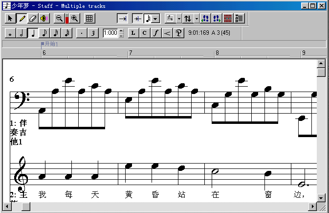 按钮,即可进入五线谱编辑窗。五线谱编辑窗是CPA9中最常用的一个窗口了,如果你不懂其他的窗口,只要你识五线谱,即可以开始作曲了。五线谱窗并不复杂,如下图: