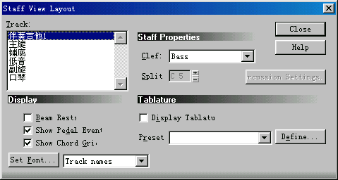 各含义如下:Display中有三项,意思分别是:把休止符和音符连起来,显示踏板事件,显示和弦标记,下面是关于视窗中所有事件的字体设置,右边是五线谱属性:CLEF(谱号选择)其中的英文含义是:高音谱号,低音谱号,高低音谱号,中音谱号,次中音谱号,高音谱号上八度记谱,低音谱号上八度记谱,打击乐谱,单行打击乐谱。SPLIT是在你选择了高低音谱号记谱时才能选取,意思是高低音谱号中以哪个音符为分界线。右边的打击乐谱设置中,你必须选择打击乐谱才可选取,点击它会出现下面的对话框: