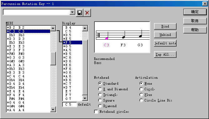 上面可以选择定义好的模板,CPA9预置了GM Standard Percussion(GM标准打击乐定义),下面左部分是MIDI音符的实际位置,右部分是显示出来的音符位置,打星号的是默认的连接。右边是音符的形状,NOTEHEAD(符头形状):标准,八叉形,三角形,方块,菱形,下面还有在符头外加一个圈。右边是符头下面的附加物,分别是:没有,圆圈,加号,φ形。有名有四个按钮分别是:建立连接,取消连接,默认音符,重置所有的连接。
