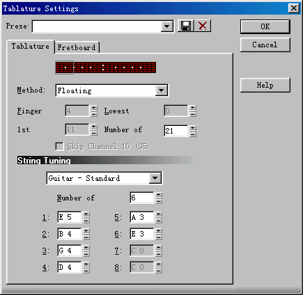 上面的PRESET(预置)和前面的一样,下面分为两页,第一页是关于吉他设置的,在METHOD中有三项,FIX,FLOATING,MIDI CHANNEL。下面的FINGER是手指按弦的最远品数,变调夹位置,下面两项是关于MIDI吉他的设置,通道和琴品数。下半部分是吉他的调弦。第二页是关于吉他板的材质选择和是否把低音弦放在上面的选择。
