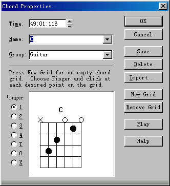 歌词键,和弦键,表情标志键,渐弱渐强标志键,踏板标志键:关于这几个按钮,主要是输入标志用的。歌词键只能一个一个的写歌词,它当然比不上歌词窗,相对来说它的功能较弱;和弦按钮:可在任何地方输入和弦,但一开始点,只会出现C和弦,你可以右键单击这个C将弹出如下对话框:
