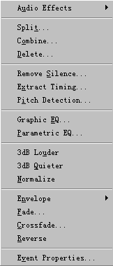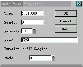 更改音频属性:开始时间,样本数,力度,名称,锚点位置(它是相对于音频事件起始点的位置,单位是样本数)。