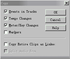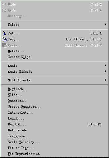 Fit Improvisation:即兴匹配,在你输入音符时,难免有不准确的现象,如果你的键盘功底非常好,并且你录制了一段很好的钢琴或打击乐(但位置可能不在标准位置),你不想破坏它,为了保持它的即兴度,又要是它们利于编辑,你可以使用这个命令。值得注意的是,在使用它之前,你必须使此轨中的第一小节的第一个音符在1:01:000处,并且使每一拍中只有一个音符(其余的音符均删去),然后执行这个命令,查看速度曲线,不再是一条直线而是一条曲线,这样即兴度就保留了下来,以后再录制此轨,而后进行量化,这时,音符既在标准位置,即兴度也无丝毫损失。