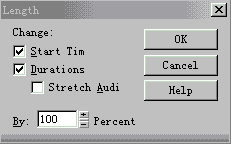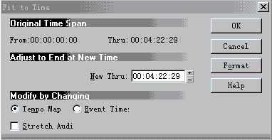 如果你编配了一段乐曲,但是你想把它和你的一段视频文件同步起来,但二者时间不同视频文件不能改,只能该MIDI这时可以用到这个命令(当然你可以去通过改变速度实现,但你怎么知道把速度改成多少合适呢),Original Time Span (原始的片段的起止时间) Adjust to End at New Time(调整到新的结束时间) Modify by Changing(改变什么) Tempo Map(速度图) Event Time(音符时值),这里 Event Time和LENGTH的效果一样即通过改变时值来改变速度,而Tempo Map则是改边速度曲线,这样的改变非常精确,无须再调整。
