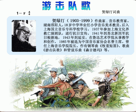 贺绿汀(1903—1999) 作曲家、音乐教育家。湖南邵阳东乡人。1923年入长沙岳云学校艺专学习。1926年入党。1927年参加了广州起义,1928年随红四军撤至海丰。1931年入上海国立音乐专科学校,师从黄自学习理论作曲。1934年,以《牧童短笛》、《摇篮曲》两首钢琴曲荣获俄罗斯作曲家、钢琴家齐尔品举办的“征求中国风味钢琴曲”的头等奖和名誉二等奖。抗日战争爆发后,参加上海救亡演剧一队赴华北宣传抗日。后到重庆,在育才学校音乐组及中央训练团音乐干部训练班任教学工作。1941年,根据周恩来同志的指示,至苏北抗日根据地参加新四军的工作。1943年到延安筹建中央管弦乐团。后任华北文工团团长。中华人民共和国成立后,曾任上海音乐学院院长、中国音乐家协会副主席、中国文联副主席和中国音乐家协会名誉主席等职。