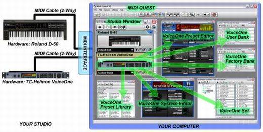 假设以下例子:你拥有两种乐器,一款Roland D-50,一款TC-Helicon VoiceOne。在这些设备都连接到计算机MIDI端口的情况下使用Midi Quest,创建一个新Studio项目,并增加这两款乐器到Studio中。