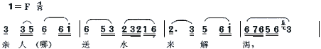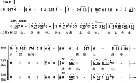 随后,用二部合唱及四部混声合唱的形式表现人民群众支援红军的情景,并歌颂了军民间的鱼水之情,旋律欢快而亲切。