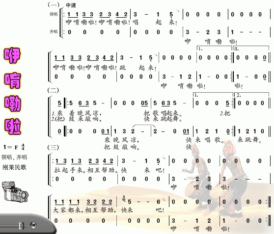 歌舞曲《咿唷嘞啦》用F大调和4/4拍子记谱。中等速度。这首歌舞曲和一般的歌舞音乐一样,其显著特点是极富节奏感。但是,它的节奏和旋律颇具特色。在歌声里,我们仿佛听到了非洲丛林里欢腾、激越的歌声和鼓声。