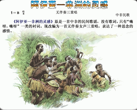 《阿伊亚—非洲的灵感》是由“黑色之音”演唱组演唱的一首中非民间歌谣。“黑色之音”是英国一个女子无伴奏歌唱团体,由5位英国籍黑人女歌手组成。她们本人来自加勒比海地区,但她们的祖先都是非洲西部黑人。该演唱组专门演唱全世界的黑人音乐,既有非洲的传统歌曲、黑人灵歌,也有拉丁美洲的黑人歌曲。该演唱组成立于1989年。她们的歌声不仅在非洲故土回荡,也把黑人音乐传播到了北美、欧洲和拉丁美洲各地。1996年2月,她们来到北京,把全球黑人丰富多彩的歌声带给中国人民,受到热烈欢迎。