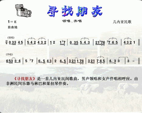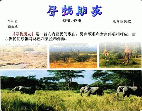 《寻找朋友》是一首几内亚民间歌曲。歌词的原意带有爱情色彩,类似于情歌。演唱形式是非洲歌唱中常见的应答歌。领唱者(男声)和合唱队(女声)用“一领一答”的方式演唱,相互呼应。演唱中,比较简单的旋律不断有所变化。这首歌曲的节奏复杂、多变,旋律短小,且多重复。歌唱由非洲民间乐器马林巴和果拉琴伴奏。