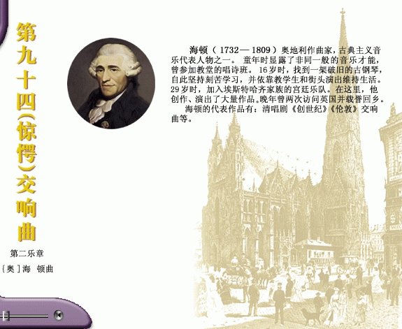 海 顿(1732~1809)奥地利作曲家。他从小便受到民间音乐、教堂音乐的熏陶,并显示出超人的才华,曾长期在宫廷中任职。