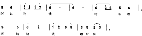 聆听《阿妈勒俄》时,应引导学生注意其三个明显的艺术特征。即:乐段的开头都用“阿妈勒俄”这个衬词启始;乐段的结尾都用