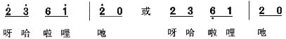 其二,每个乐段的结尾都使用固定的旋律及衬词。如: