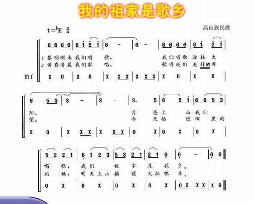《我的祖家是歌乡》是流传在台湾高雄、台东一带的排湾支系民歌。它属于舞歌类的“欢乐舞曲”。这首歌通过赞美祖祖辈辈喜爱唱歌的风俗习惯来表现高山族人民憧憬美好幸福生活的思想感情。