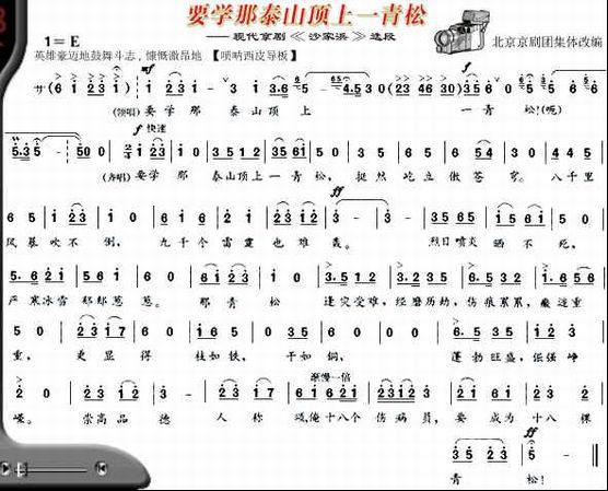 学唱现代京剧《沙家浜》选段《要学那泰山顶上一青松》,主要用跟随音响(录音)的方法,和着音乐轻声直接唱词。这样一则可以减少识谱的难度,二则可以通过模仿掌握演唱风格。由于这个年龄段很多学生处于变声期,所以学生演唱不能过于用力,在高音处可以用假嗓唱。