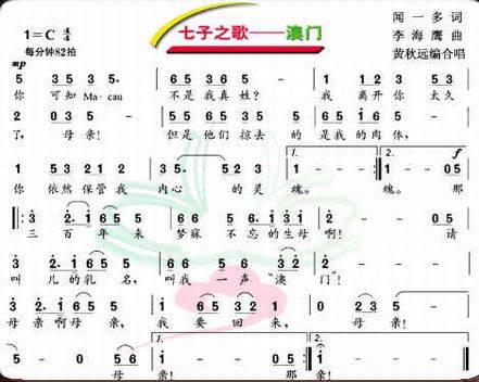 1.《七子之歌》是闻一多先生于1925年创作的一部组诗。组诗分七章。它们分别是:澳门;香港;台湾;威海卫;广州湾;九龙;旅顺,大连。《澳门》是组诗为首的一章。原诗全文如下: