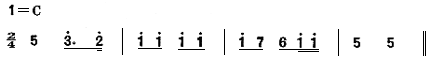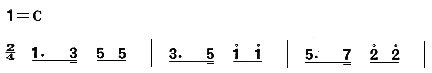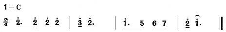第二部分(B)的第一、二乐句,是第一部分第一乐句的变化反复,接着出现了连续上行的自由模进,把歌曲推向第一个高潮: