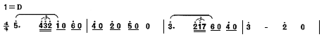 这部分音乐用主、属和弦的分解和弦构成旋律,采用问答式的手法作为旋律的基础,并在此基础上予以发展,给人以雄壮有力、流畅明快的感受。随后,呈现了一段柔婉轻盈的旋律: