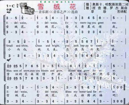 《音乐之声》的故事讲述了发生在20世纪30年代奥地利萨尔茨堡的事情。在萨尔茨堡一座古老的修道院中有一名叫玛丽亚的年轻修女,她生性活泼、热爱生活、擅长弹吉他、喜欢唱歌。后来,玛丽亚到特拉普特上校家担任家庭教师,玛丽亚用爱心与音乐和几个失去母爱的孩子建立了良好的关系。在上校离家期间玛丽亚和孩子排练了合唱。孩子们用甜美、和谐的歌声迎接上校回家,歌声深深打动了上校,激发了他歌唱的兴致。上校轻拂六弦琴,唱了《雪绒花》,歌曲表达了他对祖国的热爱之情。