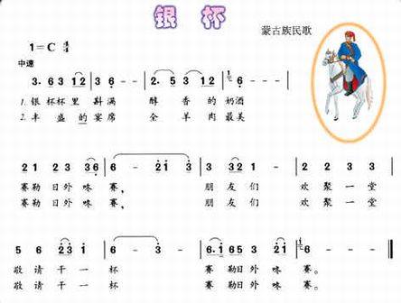 《银杯》是流传在鄂尔多斯草原的一首短调民歌(风俗性宴歌)。每当节日集会、招待宾客的时候,主人之家便会在饮宴的过程中载歌载舞地高唱宴歌,以示对宾客的盛情。通常,宴歌的歌词多为珍重友谊、尊老爱幼、提倡团结的格言警句。