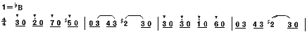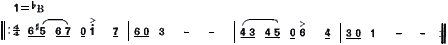 B段主题,从坚定、短促的乐句开始,用模进的手法来发展旋律,也很有特色。B段主题也反复一遍: