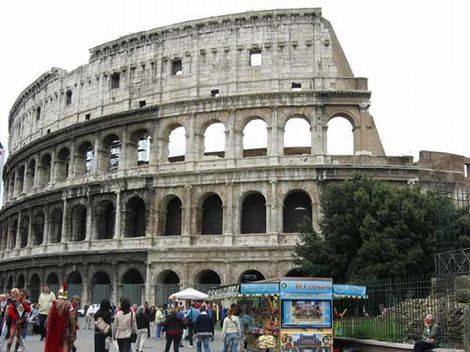 意大利的标志性建筑──古罗马竞技场,又叫斗兽场。斗兽场建于公元72年,相传是由四万名奴隶在八年内完成的,总共有三层。据说在斗兽场完全峻工后曾经在这里举行过为期100天的庆祝活动,有三千名角斗士丧生,五千头动物被杀害。总之,关于斗兽场的传说我们从小就已经听说了不少,可真正身临其境了还是免不了要感叹其工程的浩大。虽然斗兽场的建筑主料──大理石早在几个世纪前就已经被搬去造圣彼得大教堂了,只留下一片断壁残垣,可单是想象昔日舞台上的决斗(舞台中心甚至可以注满水用来打海战)就足够让每个人热血沸腾的了。站在饱经沧桑的古罗马竞技场中,多少世纪前奴隶与野兽之间拼死的搏杀仿佛就在眼前。兵器的交戈与垂死的哀鸣就在耳边回响。不觉间发现眼睛里竟已充满了泪水。我们为中国上下五千年的文化所骄傲,而罗马同样可以用它那厚重的历史沉淀打动世界上任何人的心。