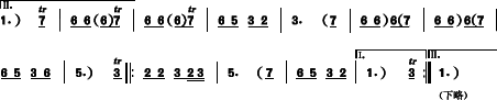乐曲的主体部分,具有浓郁的河北民歌风格。它豪爽奔放,歌唱性很强。从结构上看,它采用了起、承、转、合、再转、再合的形式,可谓严谨、工整。特别是乐曲的句子或长或短地都有所重复,因而在民间把这种重复现象称之为“句句双”。
