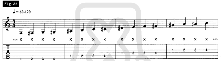 为歌曲定一个合适的速度是节拍器的主要用途,但是让我们先来学习一些基本技巧。基本的手指练习是非常好的练习模式,因为它让我们的手"自动导航"使我们能把注意力集中到节奏上。先把节拍器设定为80 bpm,然后用你的脚随着它的节奏轻轻地打拍(一拍一下)。当你确定你的脚能和节拍器保持相同的频率后,开始按照图3A进行练习,节拍器每响一次,你就弹奏一个音符。看起来简单是不是?试着保持这个节奏练习3分钟(一首歌曲的基本长度)。如果你轻松完成,就可以把速度提高百分之10到15(例如88、100或112)直到你达到120 bpm。