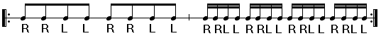 下面再跟大家介绍一些单击与双击技巧相结合的复合式打点(Paradiddle)的练习方法供大家参考练习。这一种的打击方式通常被使用于进行乐队(Marching Band)。较少被使用于古典的打击技巧。不过在有些时候还是可以运用上,特别是在打击一整组的综合乐器时可以很方便的运用此种手法。不过就我个人的观点里,此种练习方式是可以多方面兼顾的。不但可以练习好双击与单击的复合练习,在往后有机会使用Paradiddle的时候,也可以很快的上手适应。