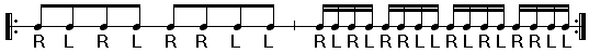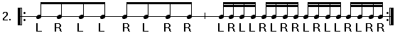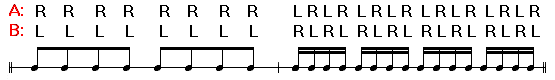 练习时请注意拍子的稳定及左右手的平衡。手法是由A─B─A─B的交换循环练习(为了是左右手都可当作起始的平衡练习)!!且请注意左右手的手抬高度,不可相差太多。打击位置要尽量靠近(音色的要求)。特别注意不可有重音!!最后一提,还是请用节拍器,由慢到快。