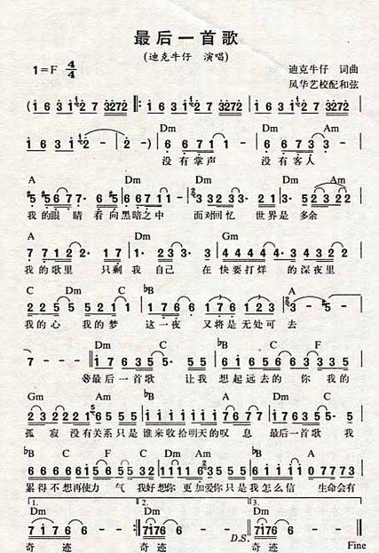 >> 最后一首歌-迪克牛仔(简谱)