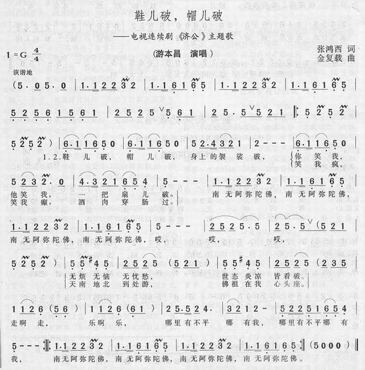 鞋儿破,帽儿破-《济公》(影视简谱)