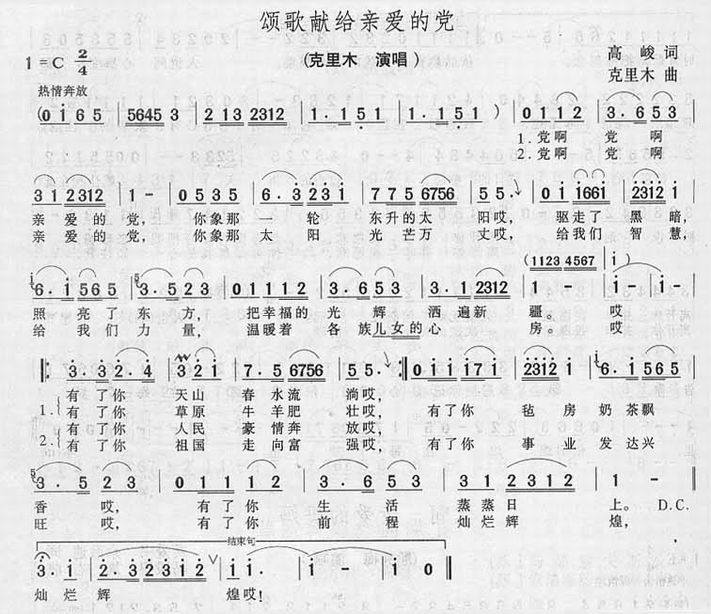 >> 颂歌献给亲爱的党-克里木(简谱)