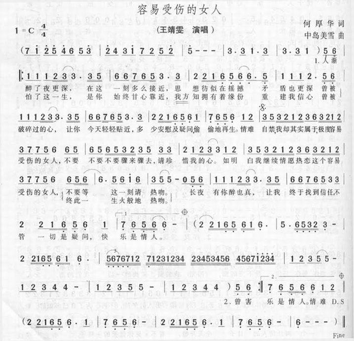 >> 容易受伤的女人-王靖雯(简谱带间奏)