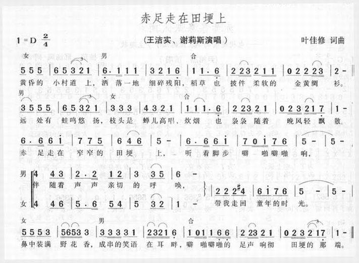 >> 赤足走在田埂上-王洁实、谢莉斯(简谱)