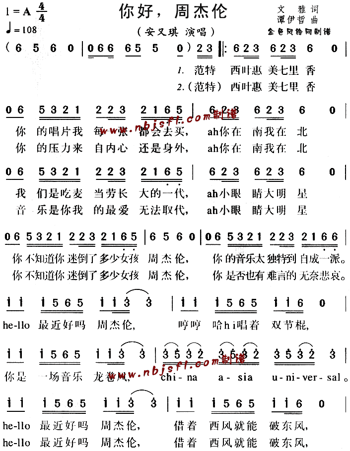 你好周杰伦-安又琪(简谱)
