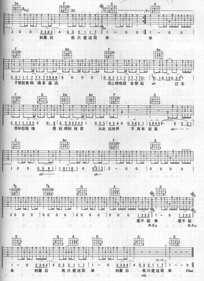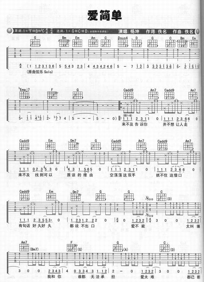 爱简单-杨坤(吉他谱 吉他六线谱 吉他歌谱 吉它谱)