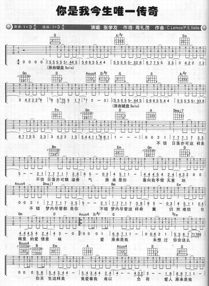 >> 你是我今生唯一传奇-张学友(吉他谱)