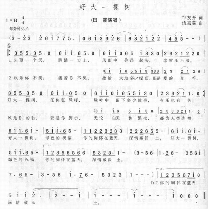 好大一颗树-田震(简谱 歌谱 歌曲简谱 合唱简谱 影视简谱 军旅歌曲简谱)