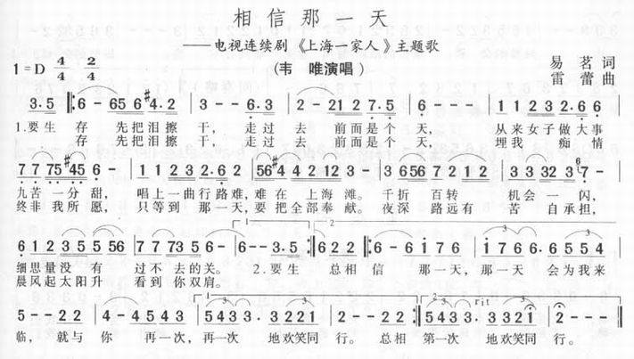 >> 相信那一天-韦唯(上海一家人影视简谱)