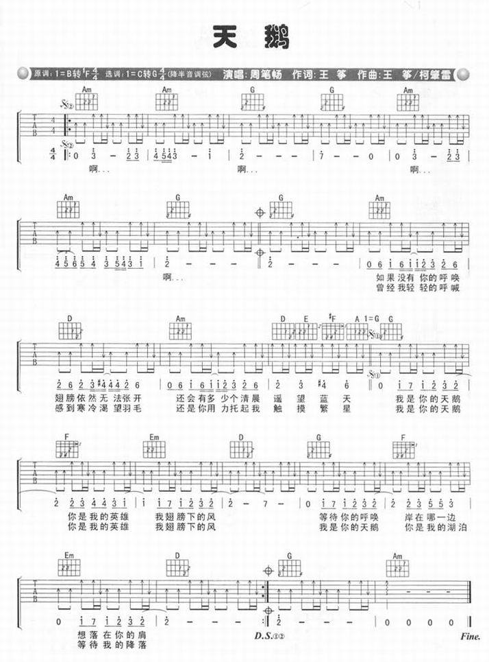 天鹅-周笔畅(吉他谱 吉他六线谱 吉他歌谱 吉它谱 影视吉他谱)