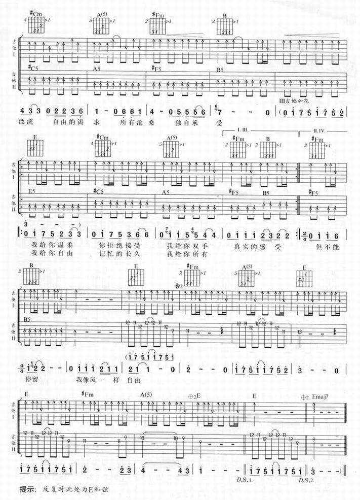 像风一样自由-许巍(吉他谱 吉他六线谱 吉他歌谱 吉它谱 影视吉他谱)