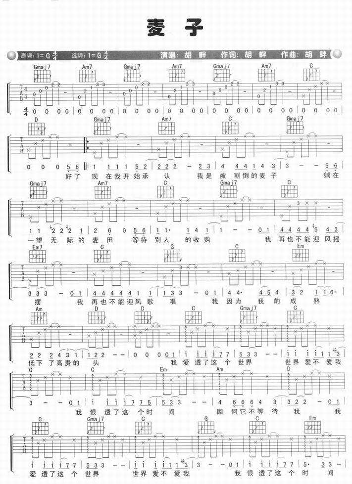 麦子-胡畔(吉他谱 吉他曲谱 吉他六线谱 吉他歌谱 吉它谱 影视吉他谱)