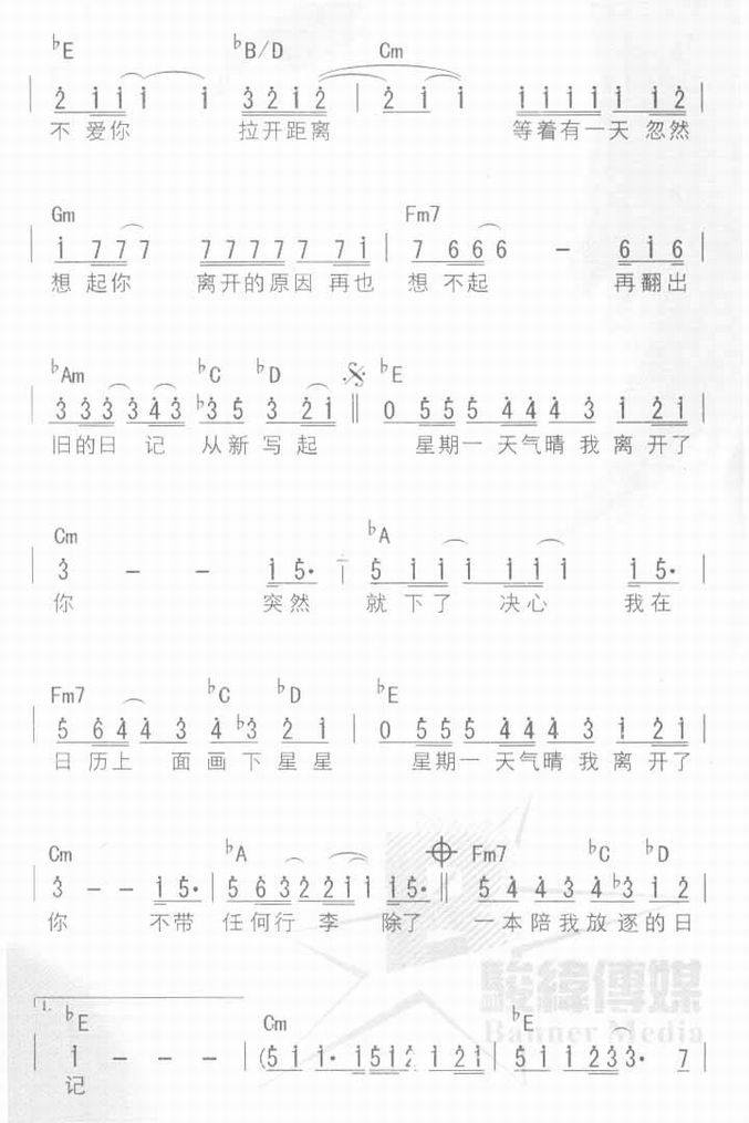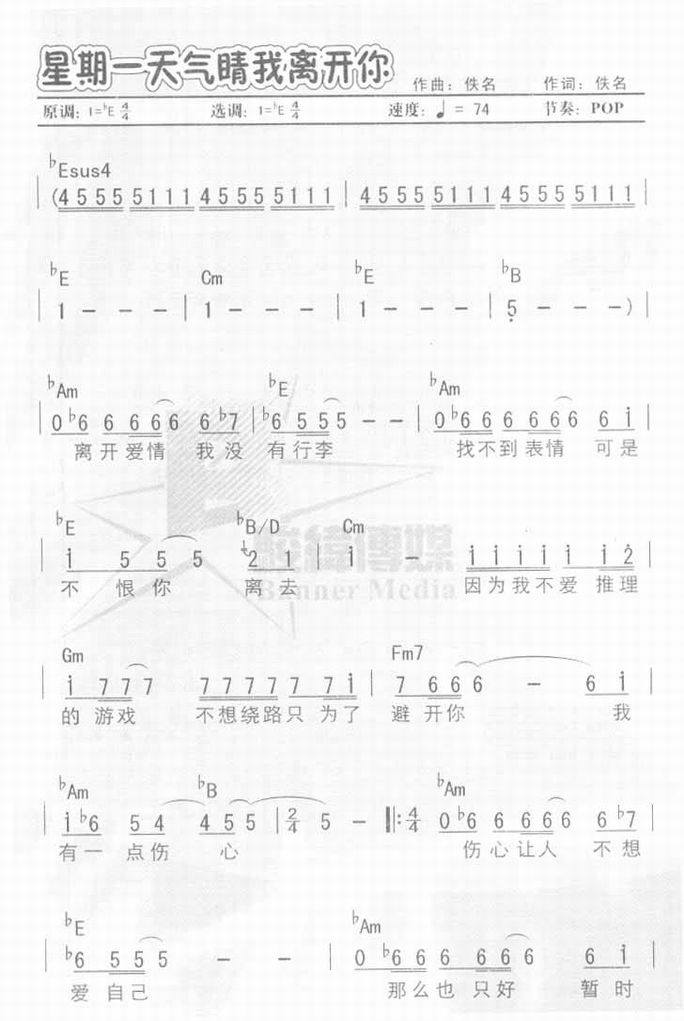 星期一天气晴我离开你-孙燕姿(简谱 歌谱 歌曲简谱 合唱简谱 影视简谱)