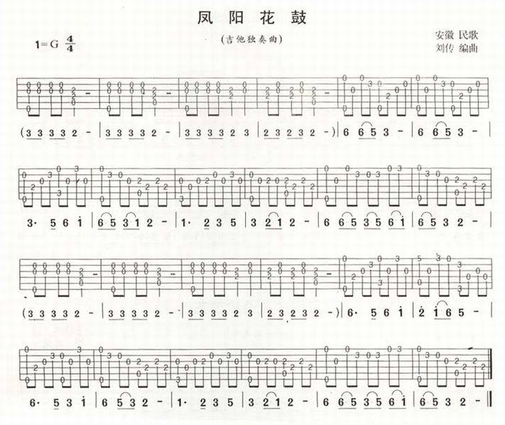 凤阳花鼓-安徽民歌(吉它曲谱 指弹独奏 吉他六线谱 吉他曲谱 吉它谱 影视吉他谱)