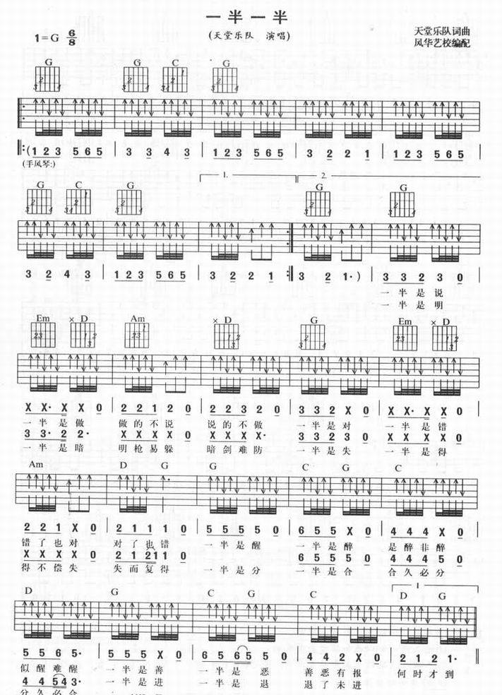 一半一半-天堂乐队(吉他谱 吉他曲谱 吉他六线谱 吉他歌谱 吉它谱 影视吉他谱)