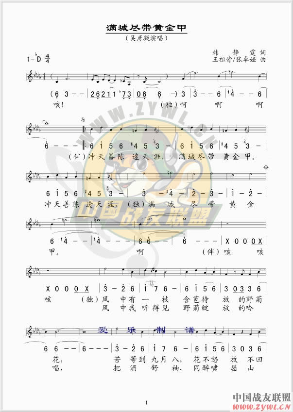 >> 满城尽带黄金甲-吴彦凝(简谱)