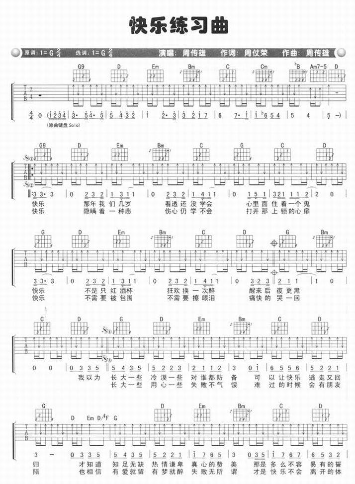 快乐练习曲-周传雄(吉他谱 吉他曲谱 吉他六线谱 吉他歌谱 吉它谱 影视吉他谱)