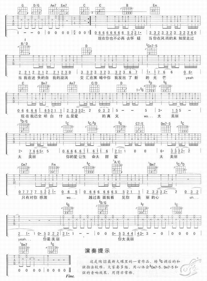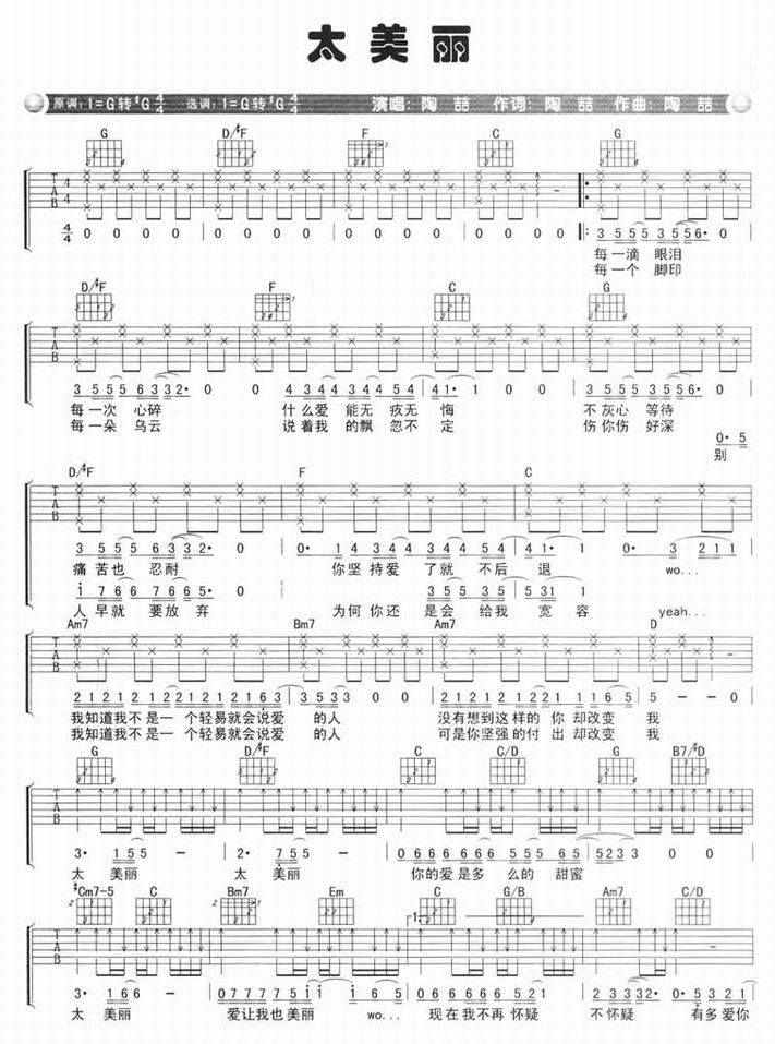 太美丽-陶喆(吉他谱 吉他曲谱 吉他六线谱 吉他歌谱 吉它谱 影视吉他谱)