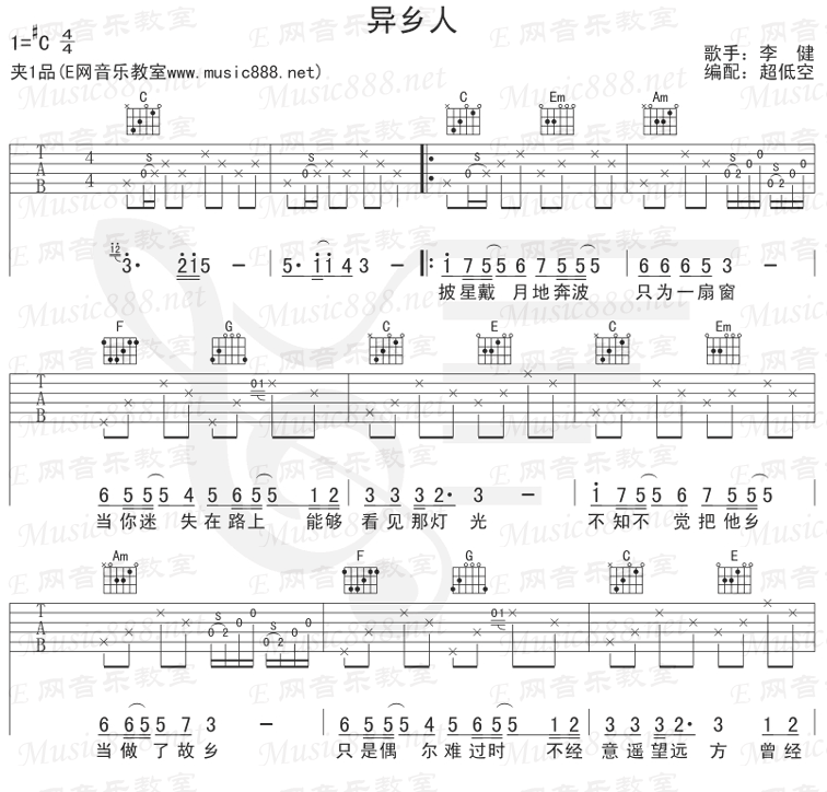 异乡人-李健(吉他谱 吉他曲谱 吉他六线谱 吉他歌谱 吉它谱 影视吉他谱)